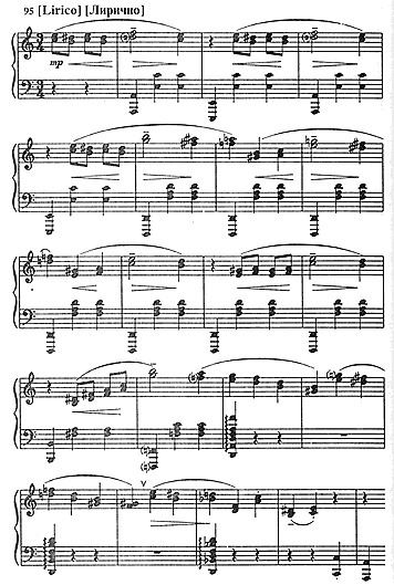 Смысловой кульминацией всего произведения является часть "Молитва" — торжественный монолог чтеца на фоне ударов большого колокола и песнопения хора с закрытым ртом. Здесь произносятся слова "Поучения", не утратившие своей актуальности и в наше время. Боязнь встать на путь зла, убить в себе духовное, утратить восприятие красоты жизни — эта мысль "Поучения" всегда волновала Гаврилина, являлась главной идеей всего его творчества (отрывок из этой части — в примере 95а). Свиридов говорил о "Перезвонах": "Это написано кровью сердца — живая, современная музыка глубоко народного склада и, самое главное, современного мироощущения, рожденная здесь, на наших просторах". Этими словами можно охарактеризовать все творчество Валерия Гаврилина. |