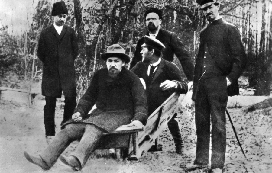 | А. Долженко (родственник Чеховых), В. А. Гиляровский, И. П. Чехов (стоят); Ан. П. Чехов, М. П. Чехов (сидят). Мелихово. 1892 г.