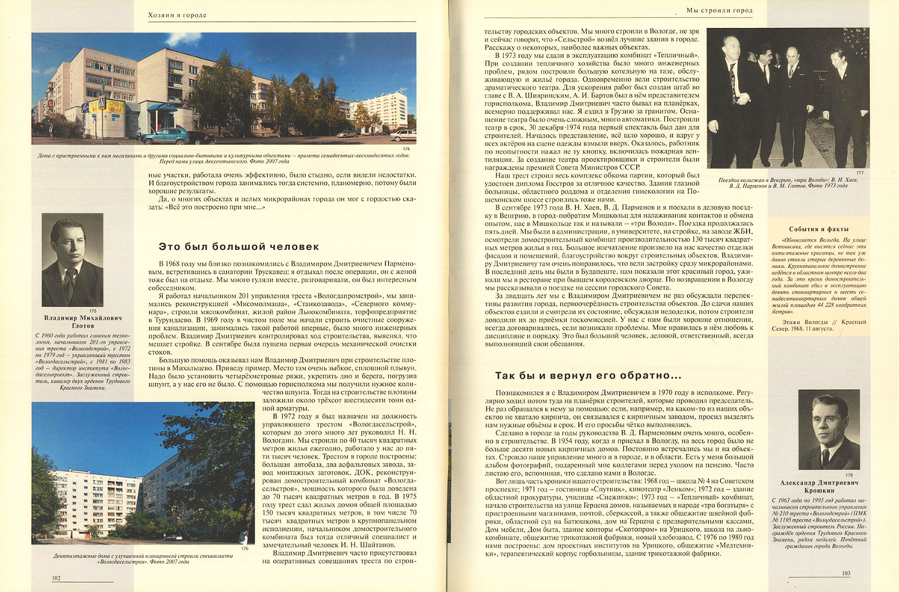 В книгу включены воспоминания 135 современников, соратников и друзей В. Д. Парменова, дополненные документами, газетными и книжными публикациями, рисуют плодотворную, разнообразную и напряженную работу горожан на благо Вологды в период ее самого интенсивного развития.