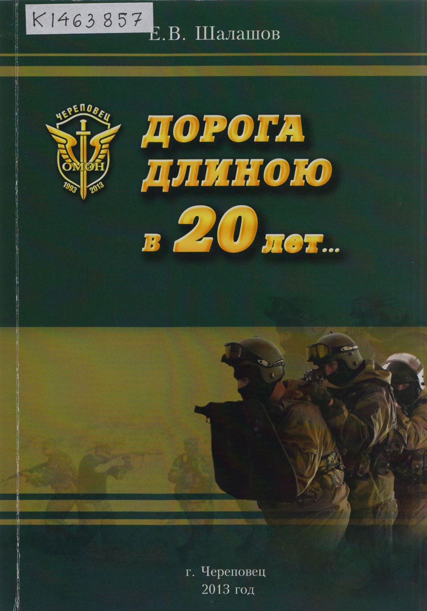 Шалашов Е.В. Дорога длиною в 20 лет... : посвящается сотрудникам ОМОН, ветеранам и семьям, памяти бойцов, погибших при исполнении служебного долга / Е.В. Шалашов. – Череповец : [б.и.], 2013 (ООО «Рекламное агентство «Инсайт плюс» ). – 200 c. : ил., портр., цв. ил. ; 21 см. – На обл.: Череповец. ОМОН, 1993-2013.