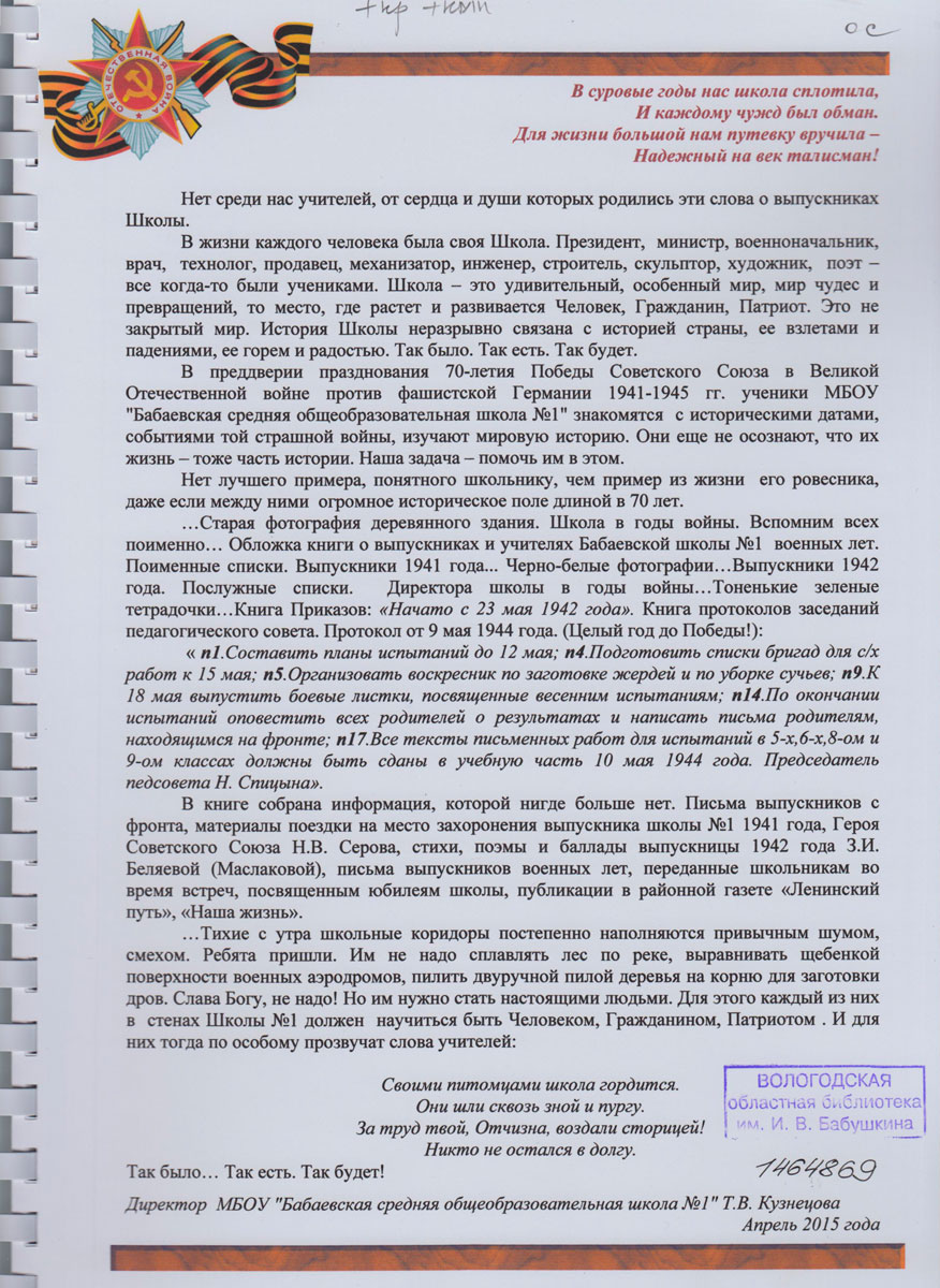 Школа в годы войны, 1941-1945 / Бабаевская средняя общеобразовательная школа №1; [авт.-сост.: Смирнова Т.Д., Тишкина И.В.]. – [Бабаево, Вологодская область : б.и.], 2015. – [138] с. : ил., портр.