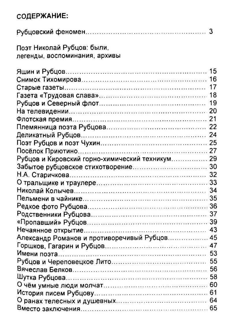 Книга состоит из коротких очерков, раскрывающих интересные детали жизненного и творческого пути поэта: историю известной фотографии поэта, сделанной оператором череповецкого телевидения А. А. Тихомировым, рассказ о взаимоотношениях Н. М. Рубцова с поэтами-вологжанами А. Я. Яшиным и С. В. Чухиным, о его дружбе с ленинградским поэтом В. С. Горшковым, малоизвестные страницы о пребывании поэта в поселке Приютино, о годах учебы в Кировском горно-химическом техникуме, о победе Рубцова на творческом конкурсе среди флотских поэтов-североморцев.