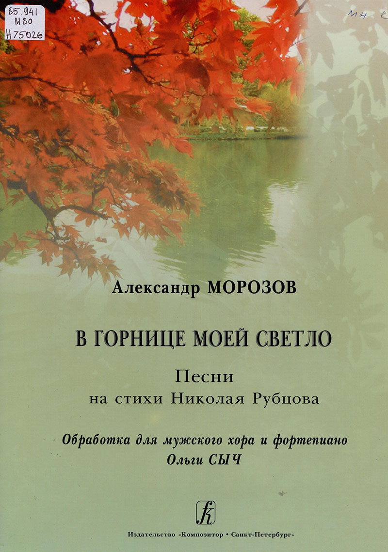 Морозов А. С. В горнице моей светло [Ноты] : песни на стихи Николая Рубцова / А. Морозов ; обраб. для мужского хора и фортепиано О. Сыч. – Санкт-Петербург : Композитор, 2015. – 35 с. |