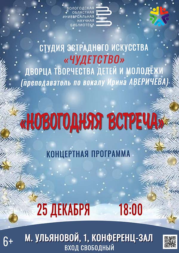 Большой праздничный концерт «Новогодняя встреча» солистов студии эстрадного искусства «Чудетство» Дворца творчества детей и молодёжи Вологды пройдет в четверг, 25 декабря, в рамках предновогодних мероприятий.