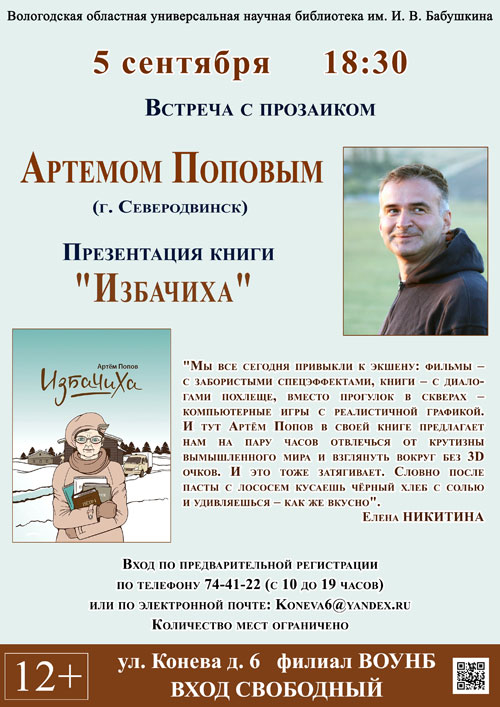 Впервые с Артёмом Поповым читатели Областной научной библиотеки познакомились в 2019 году и заручились его обещанием привезти в Вологду новую книгу. Обещание писатель сдержал. В первую субботу сентября он представит вологжанам сборник рассказов «Избачиха» (Архангельск, издательство «Лоция», 2020). Герои книги – современные деревенские жители и горожане – выходцы из северных деревень. Именно туда, где берут начало его родовые корни – в Великоустюгский район Вологодской области – Артём Попов стремится приехать каждое лето, посвящая своё творчество родной деревне.