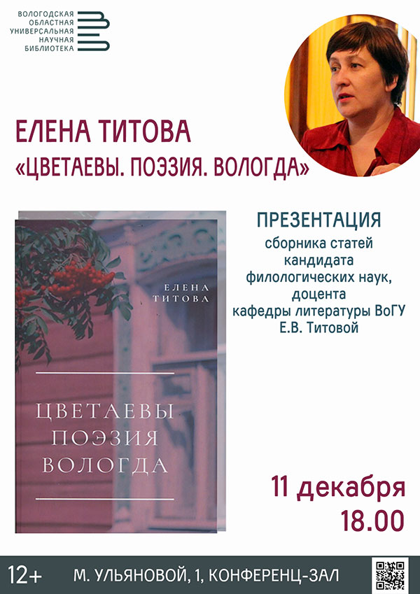 Презентация сборника статей «Цветаевы. Поэзия. Вологда» кандидата филологических наук, доцента кафедры литературы Вологодского государственного университета Елены Витальевны Титовой, пройдёт в среду, 11 декабря.