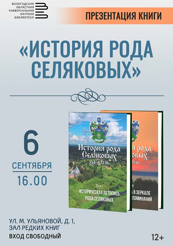 Презентация новой книги «История рода Селяковых, XVI–XXI вв.» состоится в пятницу, 6 сентября.