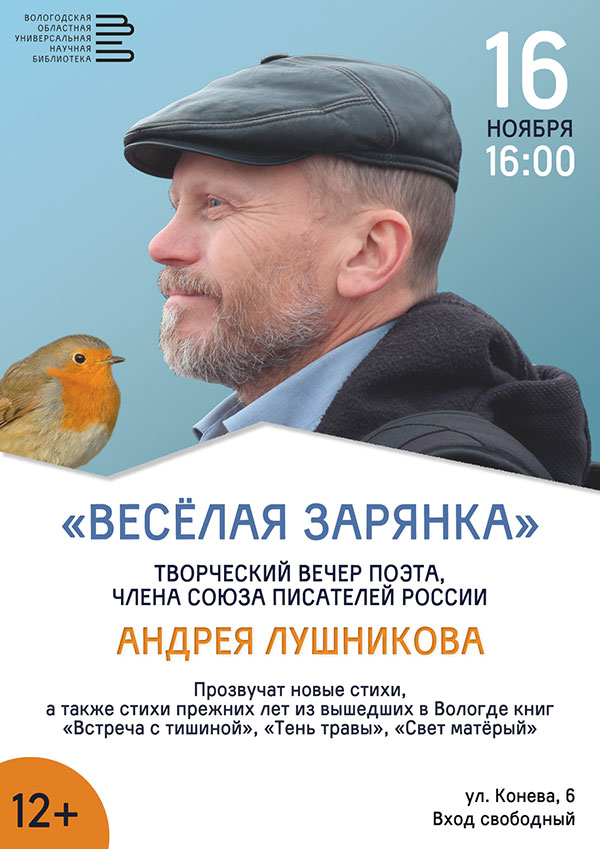 «Веселая зарянка» – так называется творческий вечер поэта, барда, члена Союза писателей России Андрея Лушникова. Мероприятие состоится в субботу, 16 ноября, в филиале библиотеки по адресу: ул. М. Конева,6.