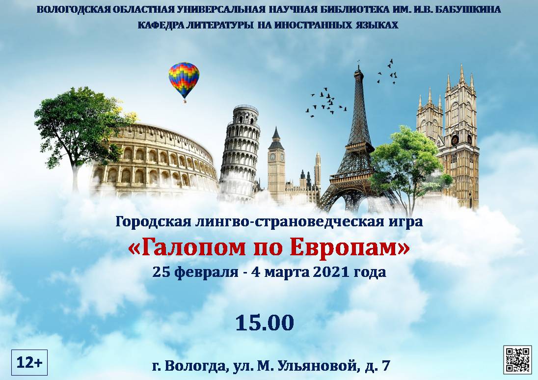 Городская лингво-страноведческая игра «Галопом по Европам» проводится Бюджетным учреждением культуры Вологодской области «Вологодская областная универсальная научная библиотека имени И.В. Бабушкина».