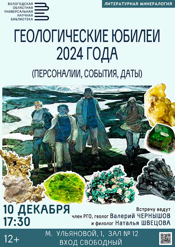 Встреча «Геологические юбилеи 2024 года» проекта «Литературная минералогия» пройдёт во вторник, 10 декабря.