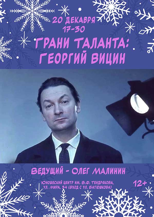 20 декабря в 17.30 в Юношеском центре им. В.Ф. Тендрякова областной универсальной научной библиотеки состоится вечер из цикла «Грани таланта», посвященный народному артисту Георгию Вицину, знаменитому советскому российскому актёру тетра и кино.