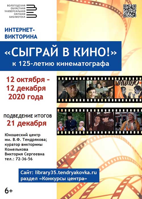 Юношеский центр им. В.Ф. Тендрякова областной библиотеки объявляет старт интернет-викторины «Сыграй в кино!». Она приурочена к 125-летию со дня создания кинематографа. Участники смогут проверить свои знания в области отечественного кино, вспомнить любимые фильмы и увидеть лучшие моменты из них.