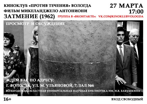 27 марта в 17.00 просмотр и обсуждение фильма Микеланджело Антониони «Затмение» (1962).