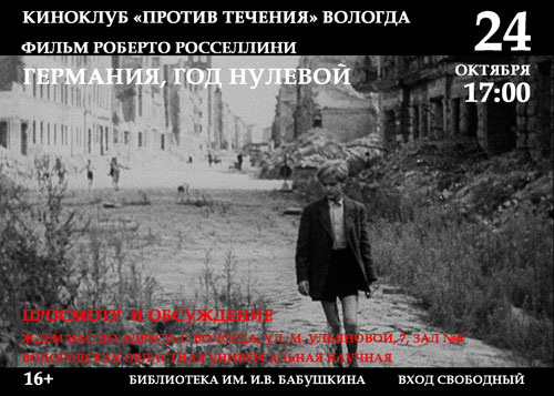 Киноклуб «Против течения» приглашает 24 октября в 17.00 на просмотр и обсуждение фильма Роберта Росселлини «Германия, год нулевой».