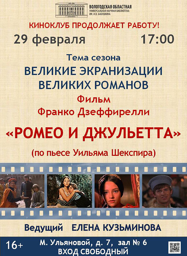 Для просмотра и обсуждения будет представлен фильм «Ромео и Джульетта», реж. Франко Дзеффирелли (по пьесе Уильяма Шекспира).