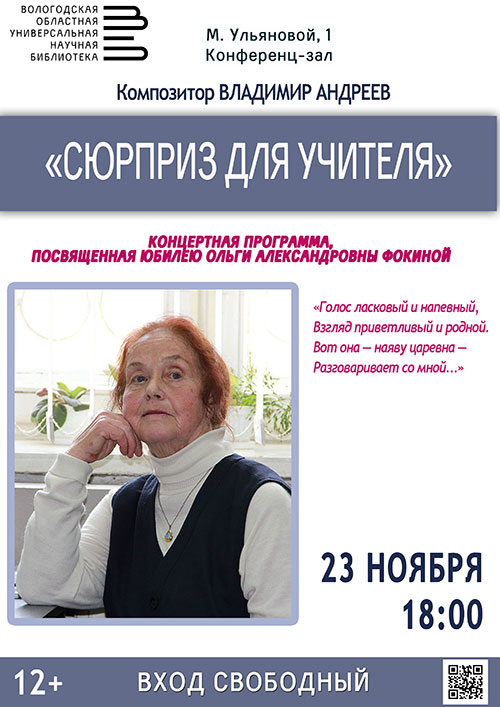 Концертная программа композитора Владимира Андреева «Сюрприз для учителя», посвященная юбилею известного русского поэта и почетного гражданина Вологды Ольги Фокиной, пройдет в среду, 23 ноября в 18 часов (М. Ульяновой, 1, конференц-зале).