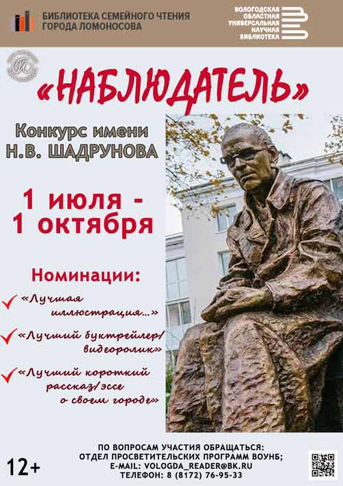 Принять участие в литературном конкурсе «Наблюдатель» имени нашего земляка, писателя Николая Вениаминовича Шадрунова (1933-2007), приглашают Вологодская областная научная универсальная библиотека и Библиотека семейного чтения города Ломоносова (ЦБС Петродворцового района Санкт-Петербурга).