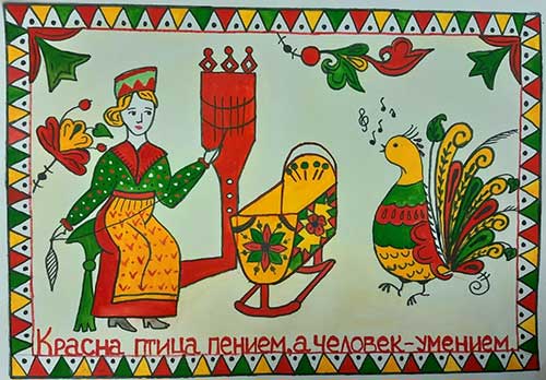 Специальный диплом – Караваева Бэлла, 7 лет, 2 класс МОУ «Шольская средняя школа», Белозерский район, с. Зубово – иллюстрация к пословице «Красна птица пером, а человек умом»;