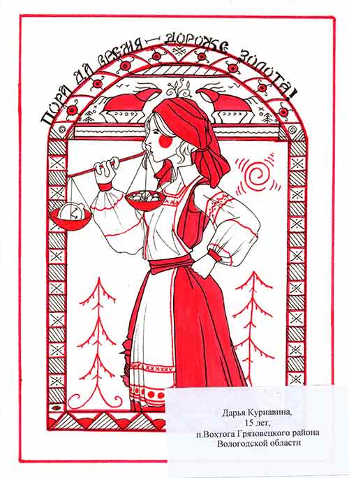 1 место – Курнавина Дарья, 14 лет, 9 класс МБОУ «Вохтожская школа», Грязовецкий район, п. Вохтога – иллюстрация к пословице «Пора да время – дороже золота»;