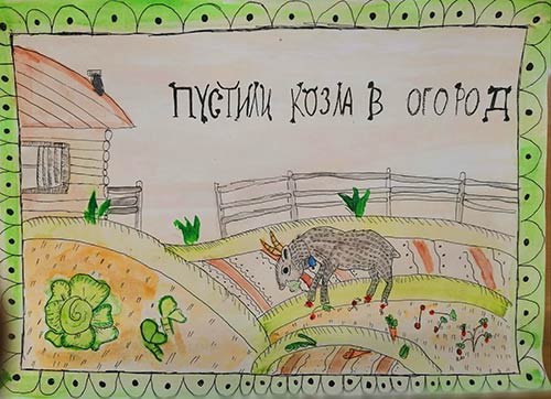 2 место – Тимошкина Анастасия, 8 лет, МАОУ ДО «Дворец детского и юношеского творчества имени А. А. Алексеевой», объединение «Изобразительное искусство», г. Череповец – иллюстрация к поговорке «Пустили козла в огород»;