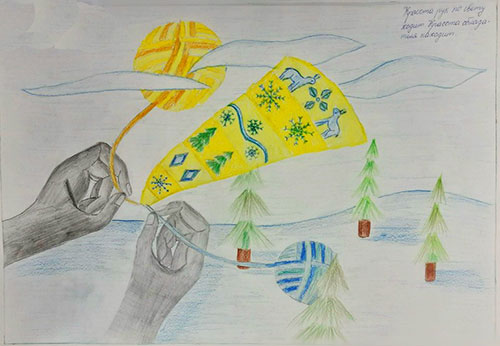 Специальный диплом – Елисеева Светлана, 7 лет, 1 «Б» класс МБОУ «Средняя общеобразовательная школа №4», г. Великий Устюг – иллюстрация к пословице «Елки приходят и уходят, а игрушки остаются»;