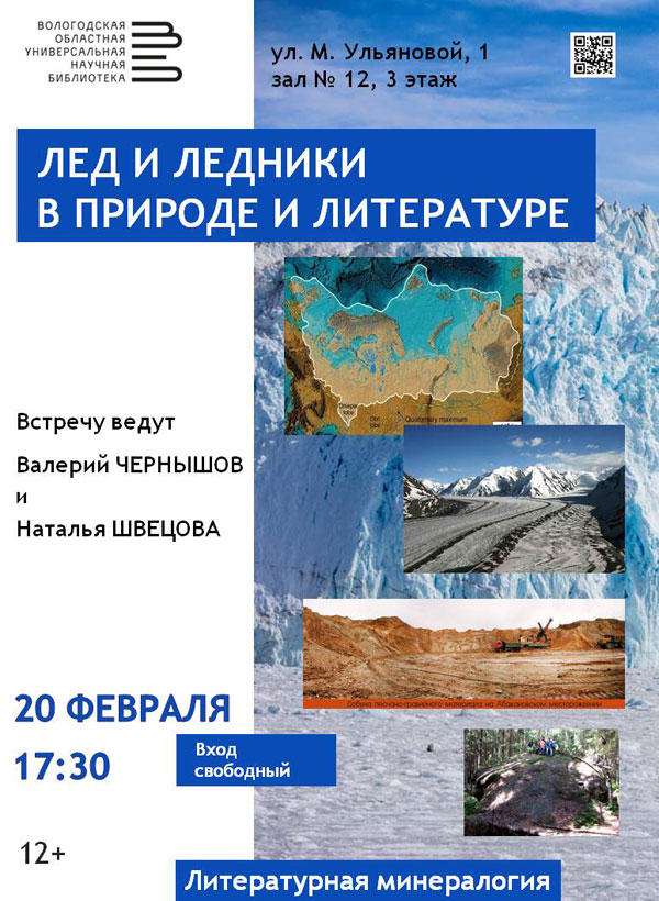 Очередная встреча проекта «Литературная минералогия», посвященная ледникам в природе и литературе, пройдет в четверг, 20 февраля, в зале № 12 Областной универсальной научной библиотеки им. И.В. Бабушкина (М. Ульяновой, 1).