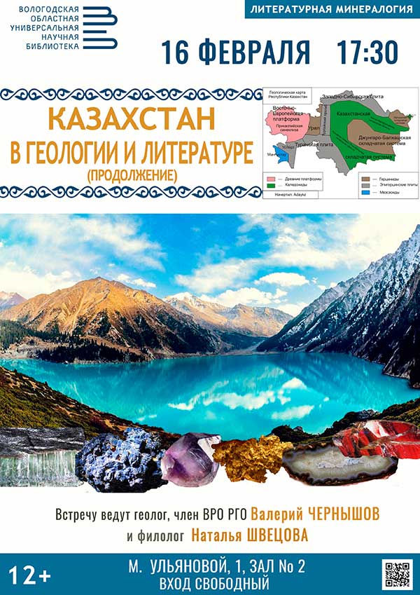 О геологическом строении и полезных ископаемых юга и востока Казахстана расскажет геолог, председатель комиссии Вологодского отделения РГО, преподаватель Вологодского государственного университета Валерий Иванович Чернышов.