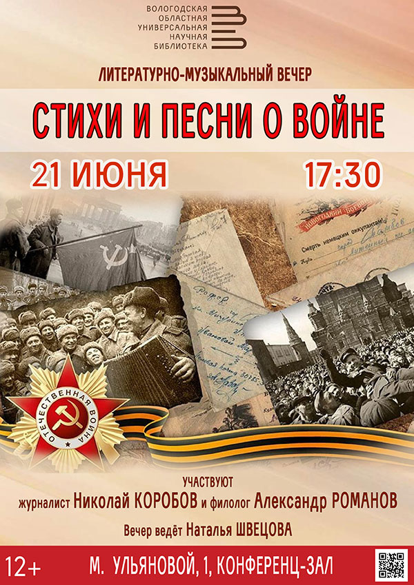 Литературно-музыкальный вечер «Стихи и песни о войне» пройдёт накануне Дня памяти и скорби, в пятницу, 21 июня, в конференц-зале Вологодской областной универсальной научной библиотеки (М. Ульяновой, 1).