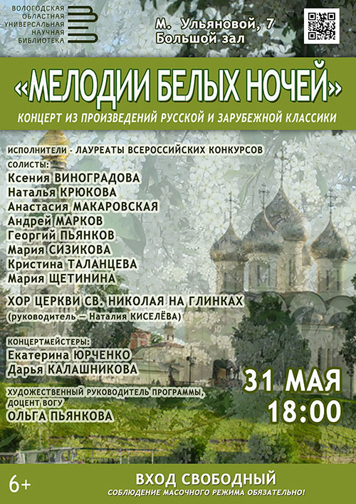 Программа «Мелодии белых ночей», в которую вошли произведения отечественной и зарубежной музыкальной классики, прозвучит во вторник, 31 мая в 18 часов (М. Ульяновой, 7, Большой зал).