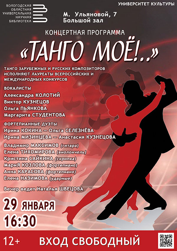 Музыкальная программа «Танго моё!..», в которую вошли вокальные и инструментальные произведения русских и зарубежных композиторов, прозвучит в воскресенье, 29 января в 16 часов 30 минут (М. Ульяновой, 7, Большой зал).