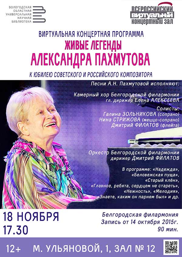 Виртуальный концертный зал библиотеки приглашает на онлайн-программу «Живые легенды. Александра Пахмутова» Белгородской филармонии (запись от 14 октября 2015 г.), посвященный творчеству известного советского и российского композитора.