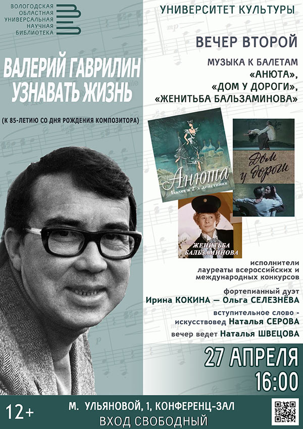 Второй концерт проекта «Валерий Гаврилин. Узнавать жизнь», посвященного 85-летнему юбилею нашего прославленного композитора-земляка, пройдет в субботу, 27 апреля в рамках проекта «Университет культуры».