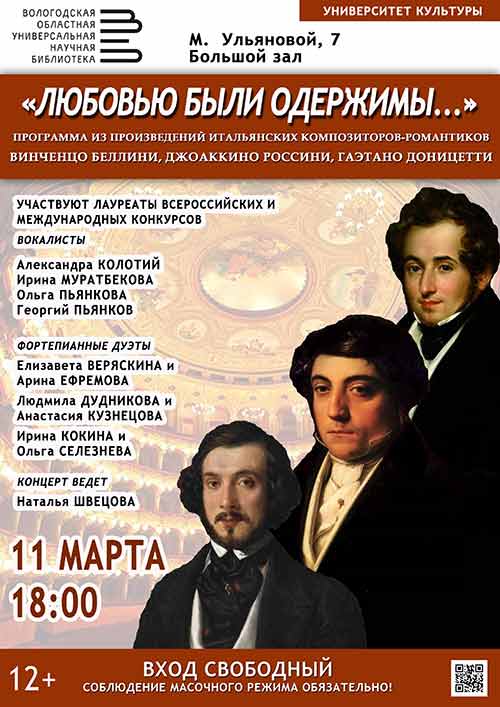 Проект «Университет культуры» приглашает вологжан на концертную программу «Любовью были одержимы…», посвященную музыке итальянских композиторов-романтиков В. Беллини, Г. Доницетти и Д. Россини. Вечер пройдет в пятницу, 11 марта, в Большом зале Вологодской областной научной библиотеки (М. Ульяновой, 7).