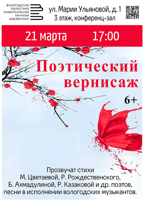 «Поэтический вернисаж» – традиционный литературно-музыкальный вечер с таким названием пройдет в понедельник, 21 марта, в конференц-зале Вологодской областной научной библиотеки (М. Ульяновой, 1) в рамках Всемирного дня поэзии.