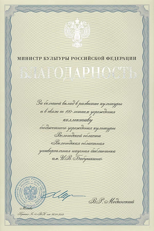 Благодарность Министра культуры Российской Федерации В.Р. Мединского