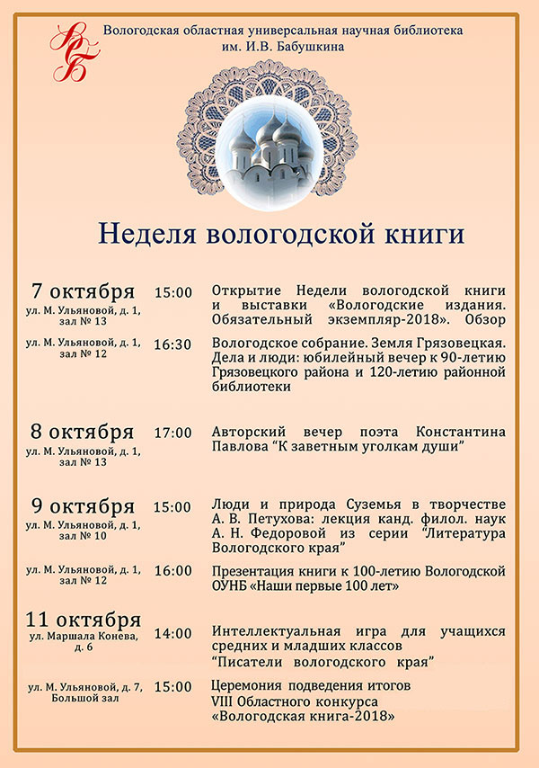 Серию мероприятий 7 октября в 15 часов откроет выставка «Вологодские издания − 2018», которая будет доступна для просмотра в течение недели в зале №13 на М. Ульяновой, 1. В экспозиции представлено 621 издание, в том числе книги, ноты, диски, подготовленные на Вологодчине в 2018 году и поступивших в Областную библиотеку в качестве обязательного экземпляра. Их обзор проведет главный библиограф, руководитель Вологодской книжной палаты Любовь Солодухина.