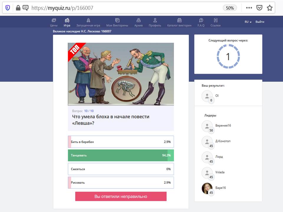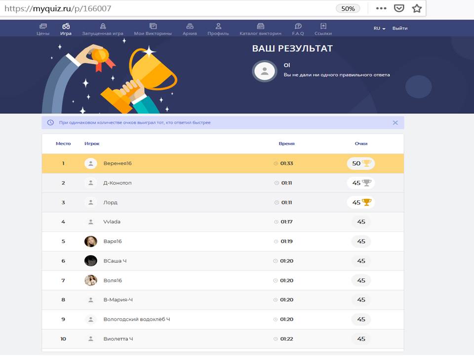Игра снова проходила не «вживую», а на сайте викторин myquiz.ru