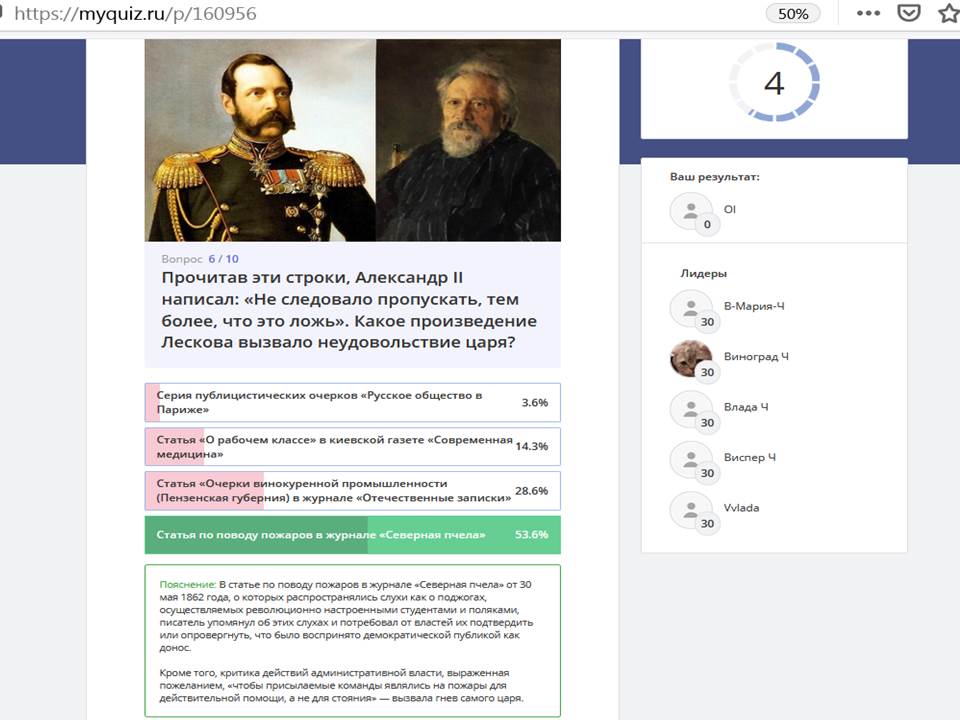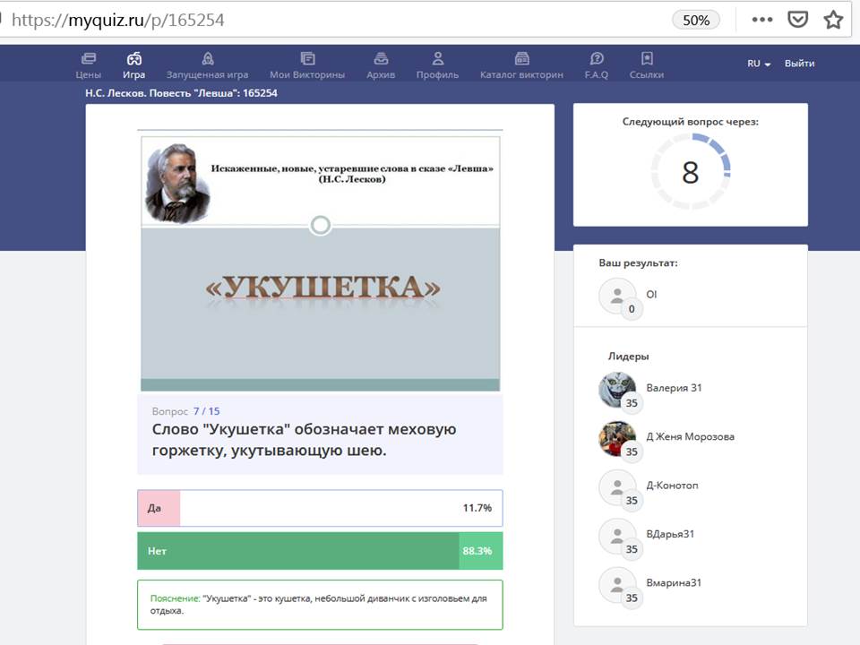Для участия в литературной онлайн-встрече «Николай Лесков: чародей слова» школьники сформировали команды, заранее изучили биографию писателя, прочитали его произведения: повести «Левша» и «Очарованный странник», рассказы «Неразменный рубль», «Привидение в инженерном замке», «Тупейный художник», «Человек на часах», а также познакомились с экранизациями произведений писателя, иллюстрациями и обложками книг его произведений.