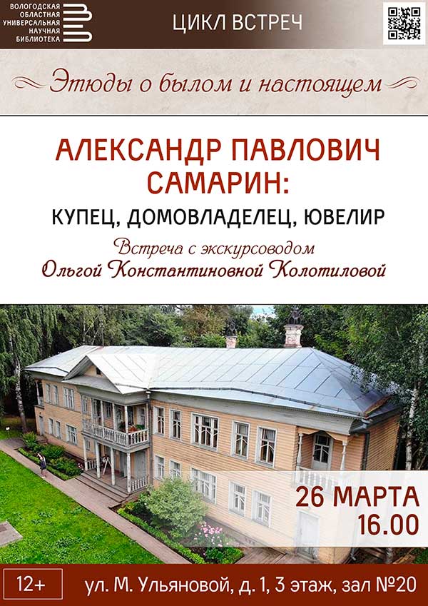 Об истории семьи Самариных и о судьбе их потомков, а также о типичной вологодской городской усадьбе, расскажет профессиональный экскурсовод Ольга Константиновна Колотилова, много лет возглавлявшая филиал «Вологда на рубеже XIX–XX веков».