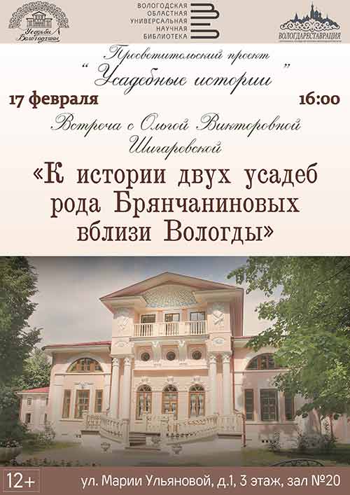 Просветительский проект филиала АУК ВО «Вологдареставрация», центра «Усадьбы Вологодчины» и ВОУНБ «Усадебные истории» приглашает на встречу с генеалогом Ольгой Шигаревской. Тема её выступления «К истории двух усадеб рода Брянчаниновых вблизи Вологды». Встреча состоится 17 февраля 2022 года в зале редких книг Вологодской областной библиотеки (ул. М. Ульяновой, д. 1, зал № 20). Начало в 16 часов.