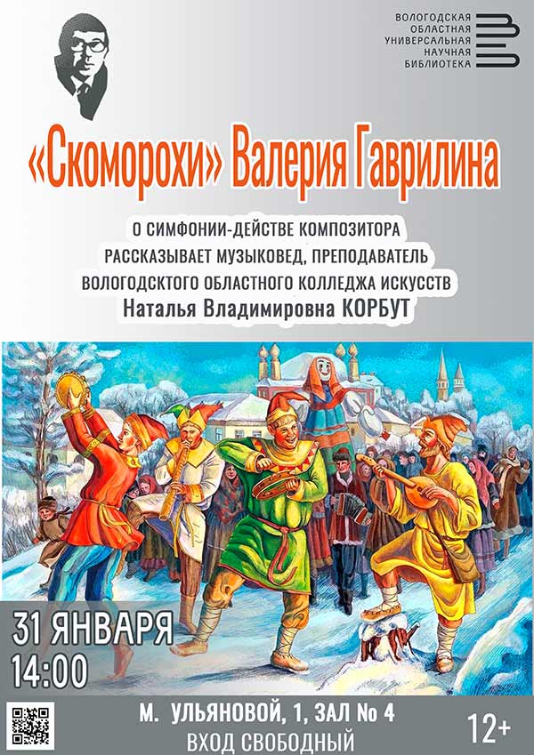 «Скоморохи» Валерия Гаврилина – так называется беседа, подготовленная музыковедом, преподавателем Вологодского областного колледжа искусств Натальей Владимировной Корбут ко дню памяти нашего прославленного земляка, композитора В.А. Гаврилина (17.08.1939-28.01.1999).