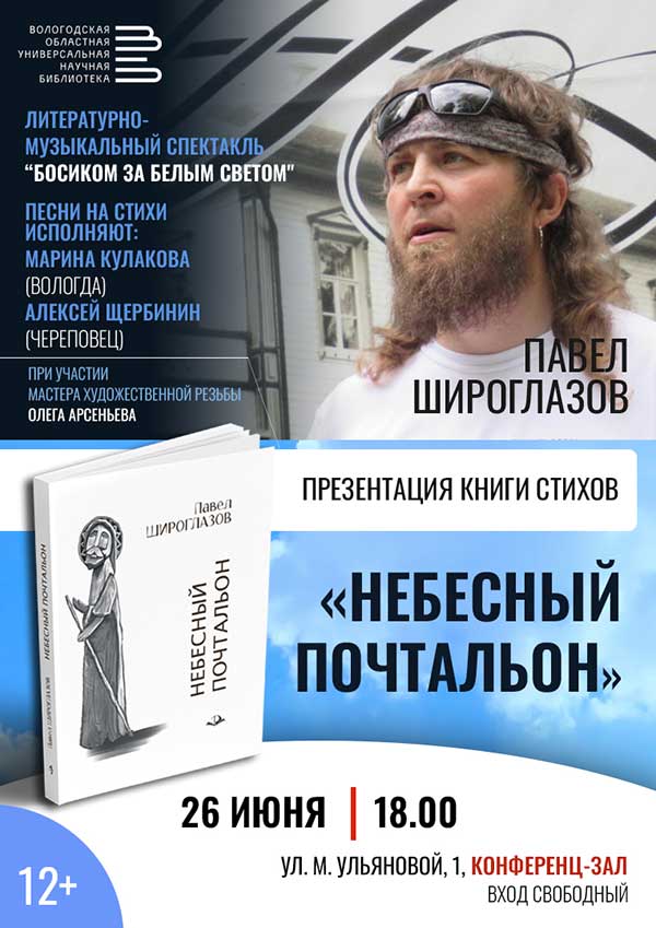 В творческом арсенале Павла Широглазова уже есть три поэтических сборника - «Нараспашку в белый свет» (Вологда, 2013), «Четвертая ипостась» (Рыбинск, 2020) и «Молоко облаков» (Череповец, 2022). В рамках презентации четвёртой книги «Небесный почтальон» в Вологде будет представлен литературно-музыкальный спектакль «Босиком за Белым Светом» по одноимённой поэме, вошедшей в книгу.
