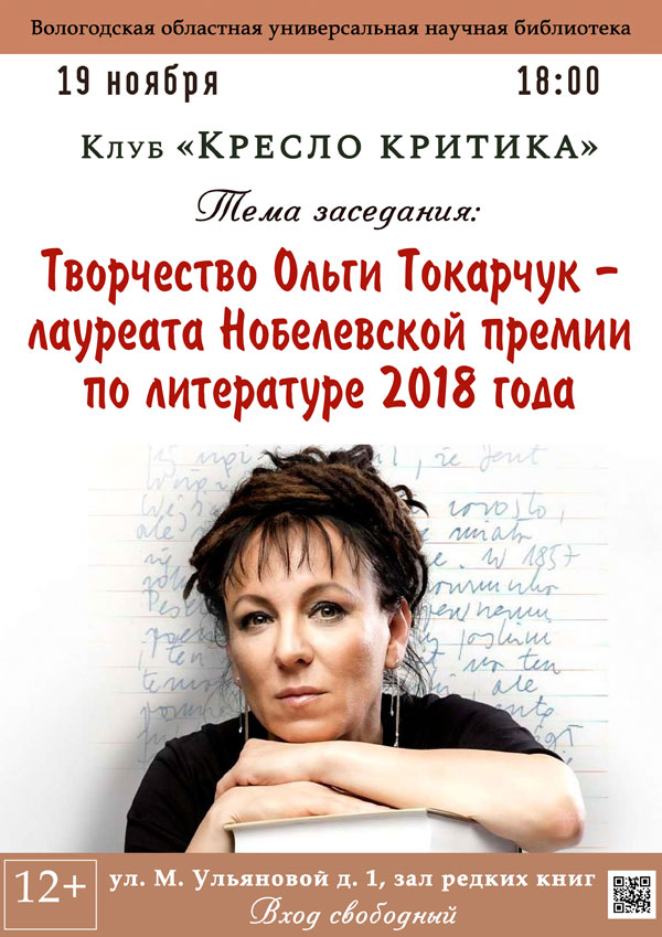 Очередное заседание клуба «Кресло критика», посвященное творчеству польской писательницы Ольги Токарчук, пройдет во вторник, 19 ноября, в зале редких книг Вологодской областной универсальной научной библиотеки (М. Ульяновой, 1).