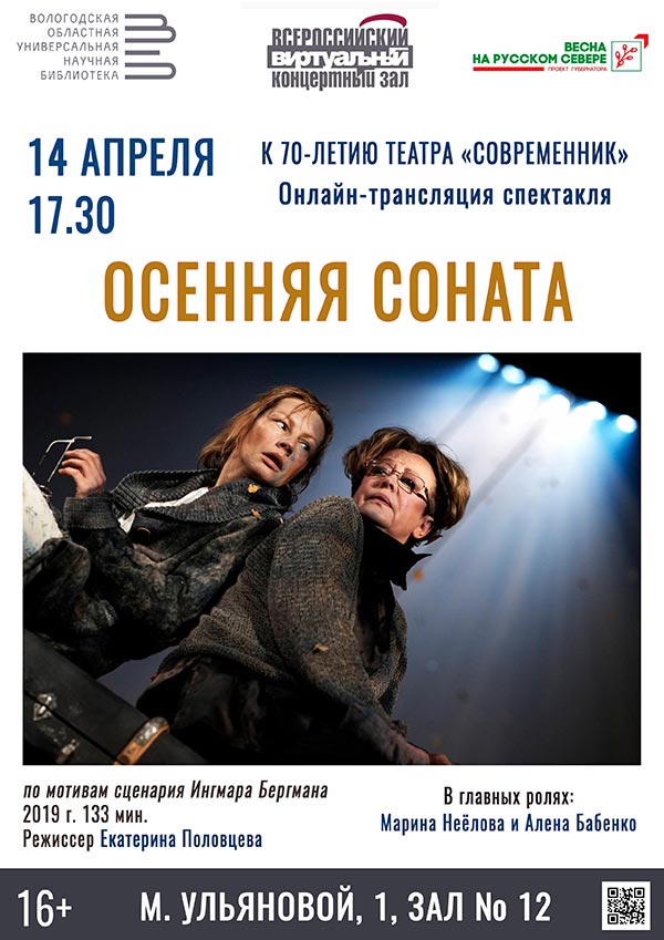 Во вторник, 14 апреля, вниманию зрителей будет предложена видеозапись сценической версии психологической драмы «Осенняя соната» Ингмара Бергмана, сделанная в 2019 году в московском театре «Современник» и посвященная 70-летию этого прославленного театра.