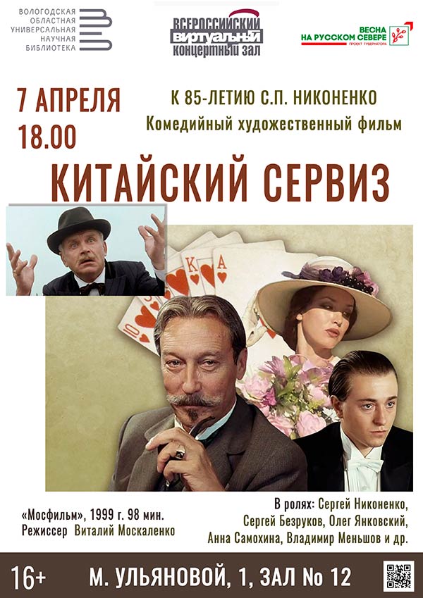 Во вторник, 7 апреля, пройдет первый кинопоказ детективной кинокомедии «Китайский сервиз» (1999), приуроченный к 85-летию со дня рождения известного российского актёра и кинорежиссёра, народного артиста Российской Федерации Сергея Петровича Никоненко.