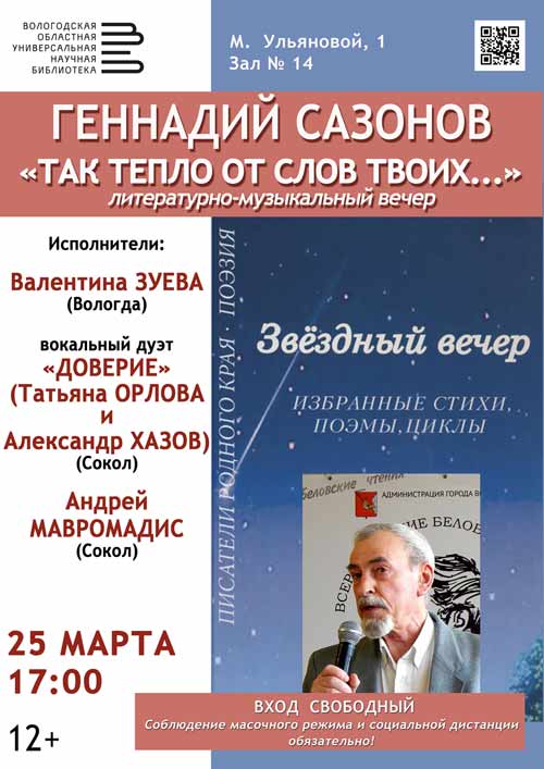 Литературно-музыкальный вечер «Так тепло от слов твоих…» по лирике члена Союза писателей РФ Геннадия Сазонова пройдет в четверг, 25 марта, в зале № 14 Вологодской областной научной универсальной библиотеки (М. Ульяновой, 1) в рамках мероприятий, посвященных 60-летию образования Вологодской писательской организации.