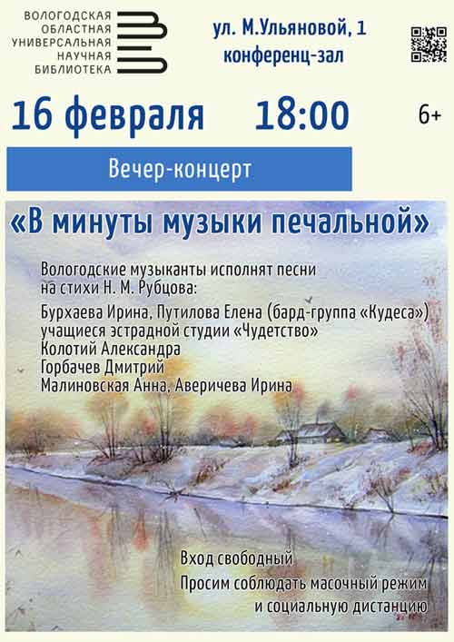 Концертный вечер «В минуты музыки печальной» из песен на стихи Николая Рубцова пройдет во вторник, 16 февраля, в конференц-зале Вологодской областной универсальной научной библиотеки (М. Ульяновой, 1, 3 этаж) в рамках мероприятий, посвященных 85-летию со дня рождения поэта.