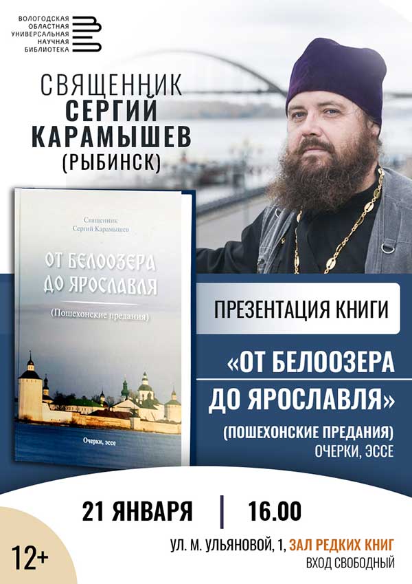 Презентация книги «От Белоозера до Ярославля (Пошехонские предания). Очерки. Эссе» иерея, члена Союза писателей России Сергия Карамышева пройдет в воскресенье, 21 января (М. Ульяновой, 1, зал редких книг).
