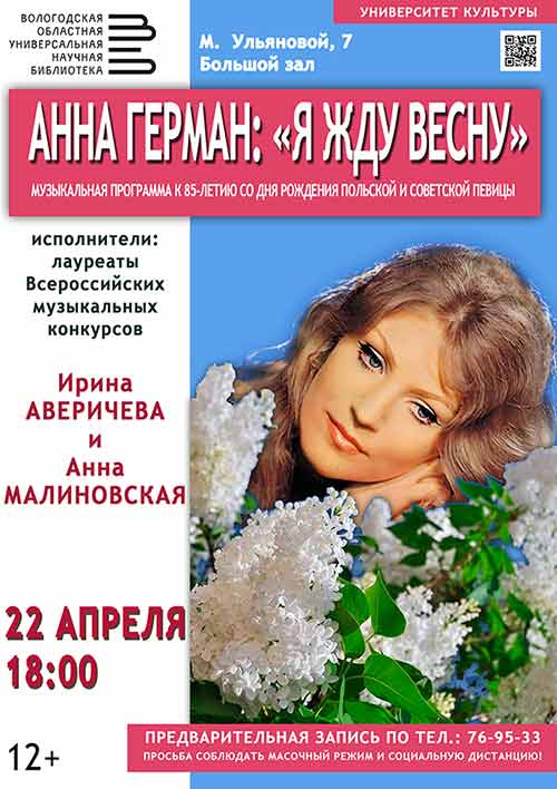 Концертная программа «Я жду весну», посвященная 85-летию со дня рождения известной певицы и композитора Анны Виктории Герман, пройдет в четверг, 22 апреля, в Большом зале Вологодской областной универсальной научной библиотеки (М. Ульяновой, 7).