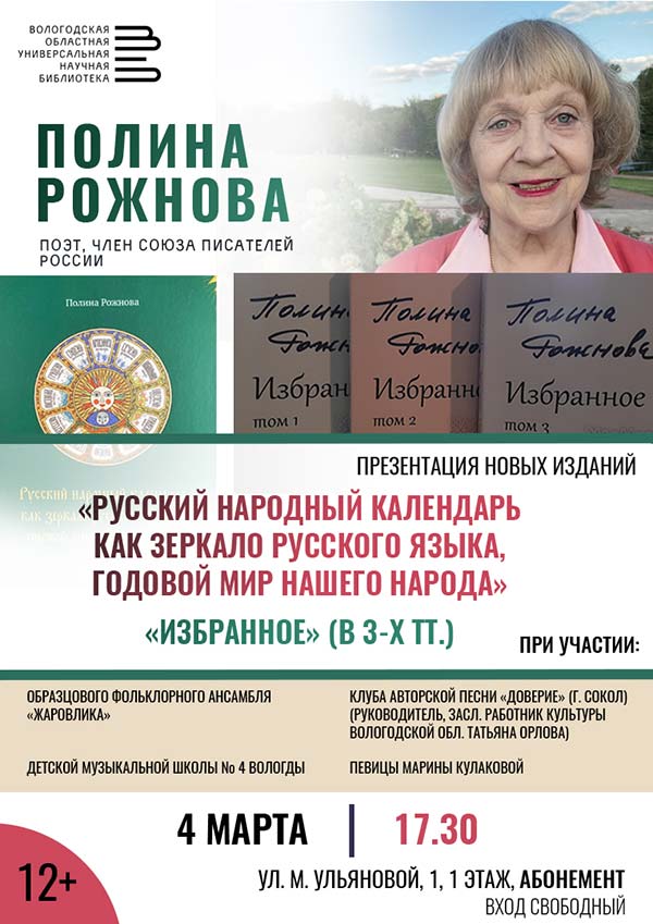 Презентация новых книг – трёхтомника «Избранное» и «Русский народный календарь как зеркало русского языка, годовой мир нашего народа» поэтессы, члена Союза писателей России Полины Константиновны Рожновой, пройдет в понедельник, 4 марта.